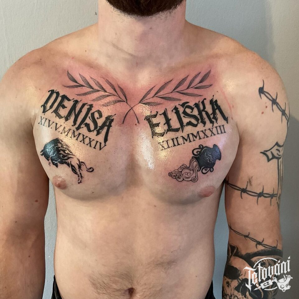 Tetování nápisy, znamení zvěrokruhu na prsa