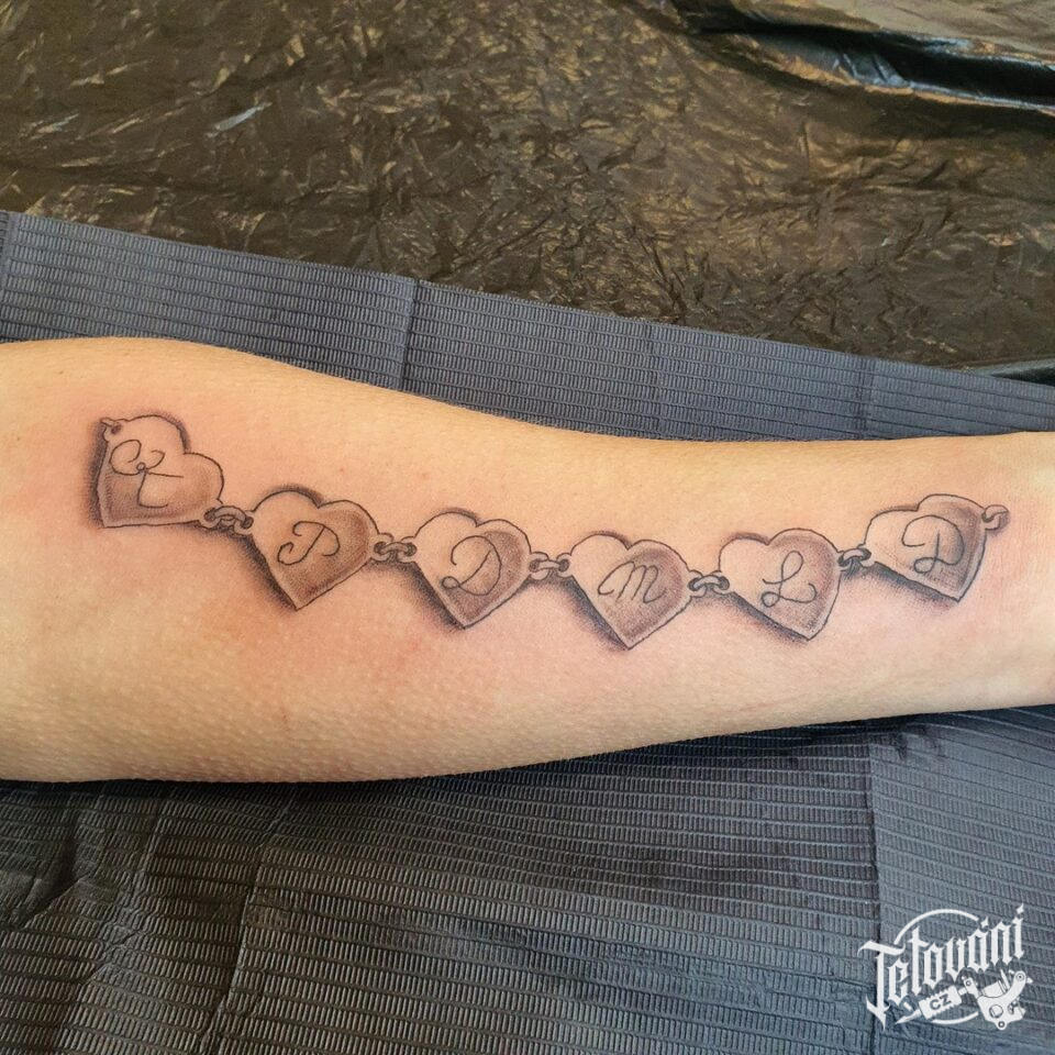Tetování náramek, řetízek srdce se jménem na předloktí