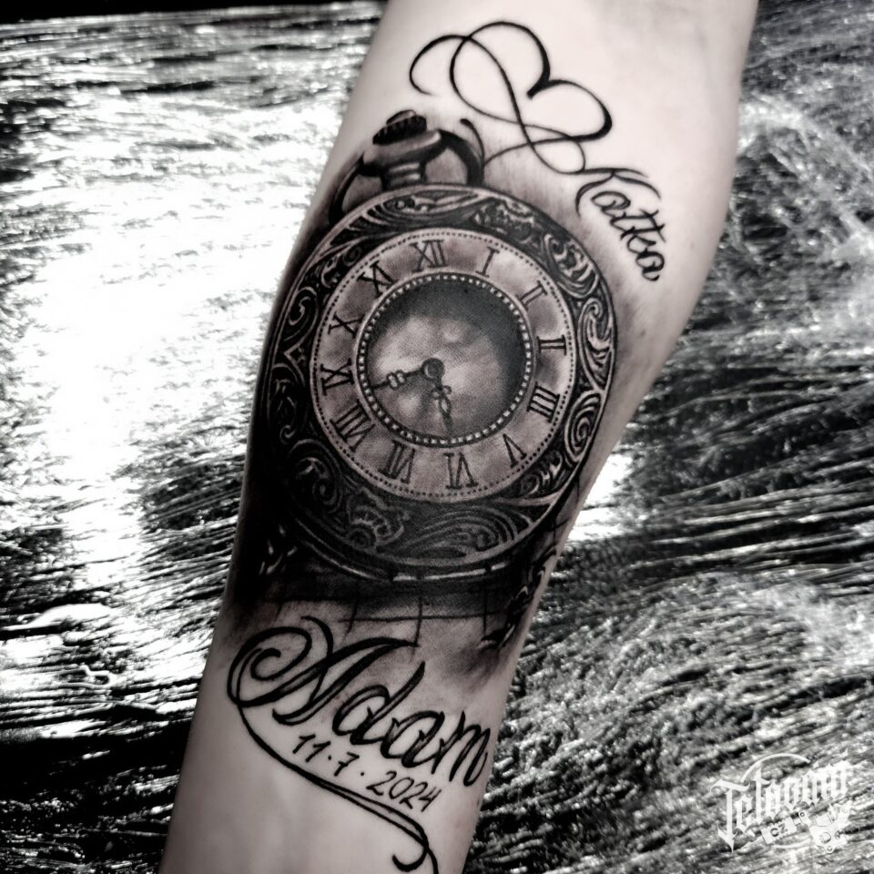 Tetování narození dítěte a hodiny, kapesní hodiny na předloktí