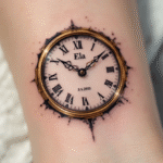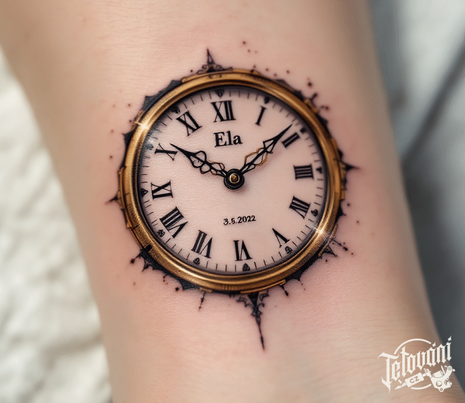 Tetování narození dítěte, hodiny se jménem Ela na předloktí