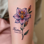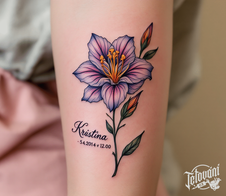 Tetování narození dítěte s časem, květina, jméno Kristinana rameno