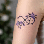 Tetování nekonečno, ležatá osmička, květiny , jméno Sofie s datumem a časem narození na rameno