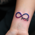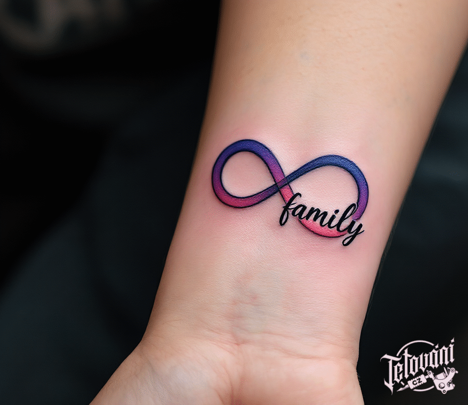 Tetování nekonečno, ležatá osmička, nápis family na předloktí