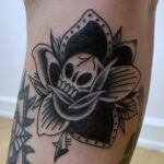 Tetování neo traditional květina, lebka, symbol na lýtko