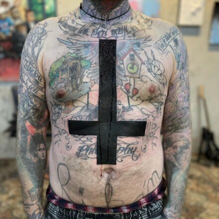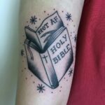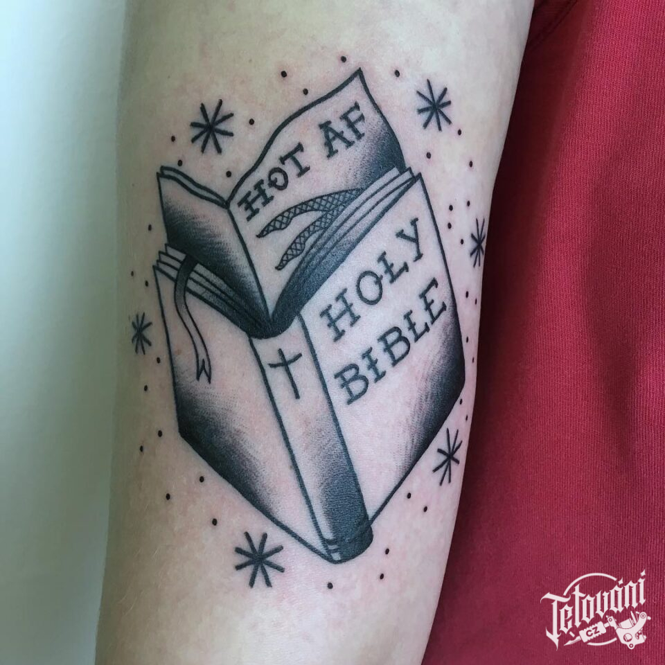 Tetování neo traditional znaky a symboly, nápisy, kříž na paži