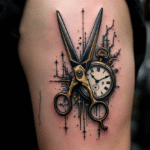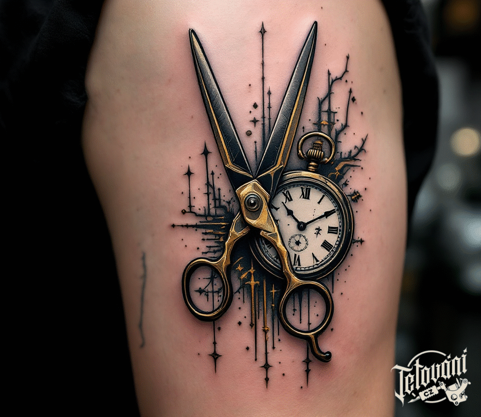 Tetování nůžky a hodiny na rameno