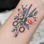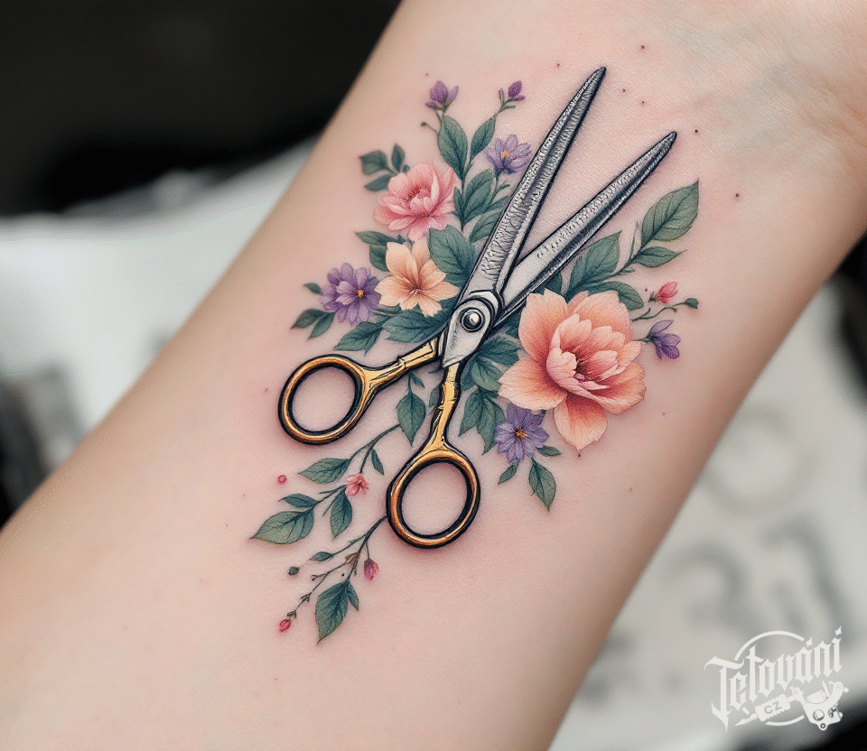 Tetování nůžky a květiny na předloktí ¨