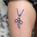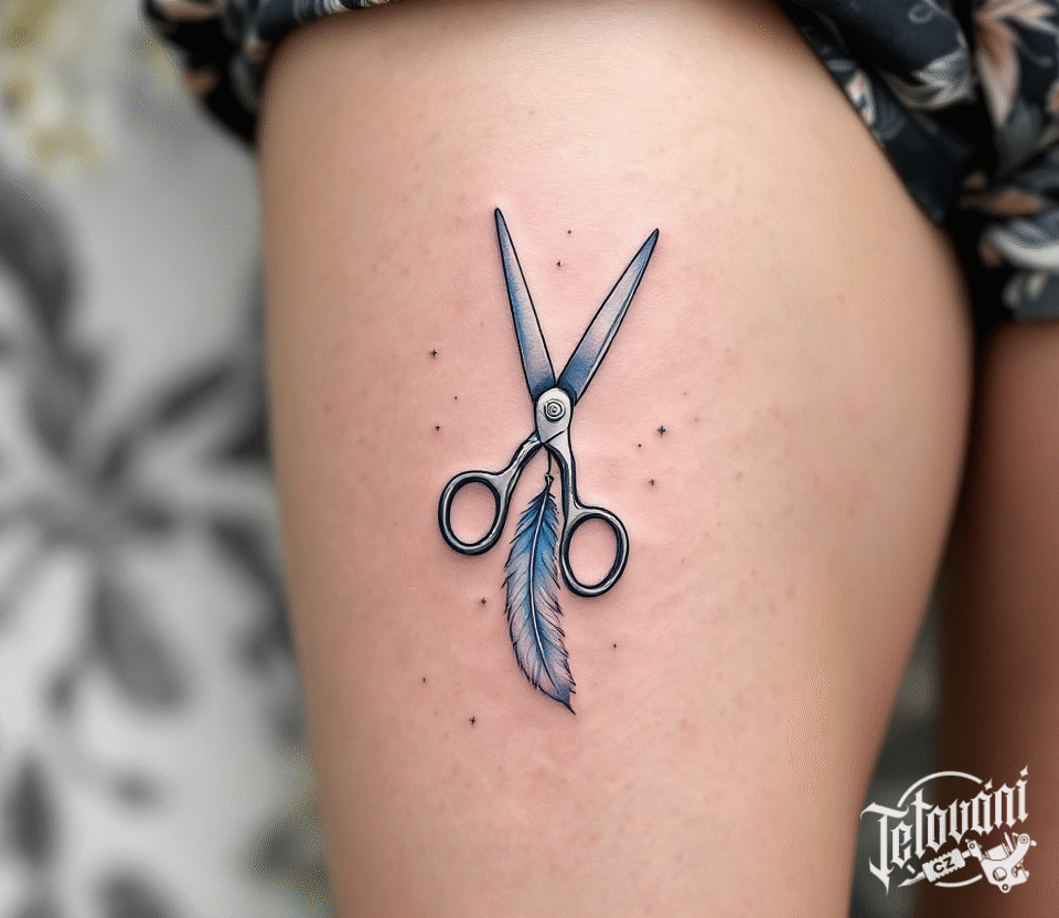 Tetování nůžky a pírko na stehno
