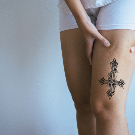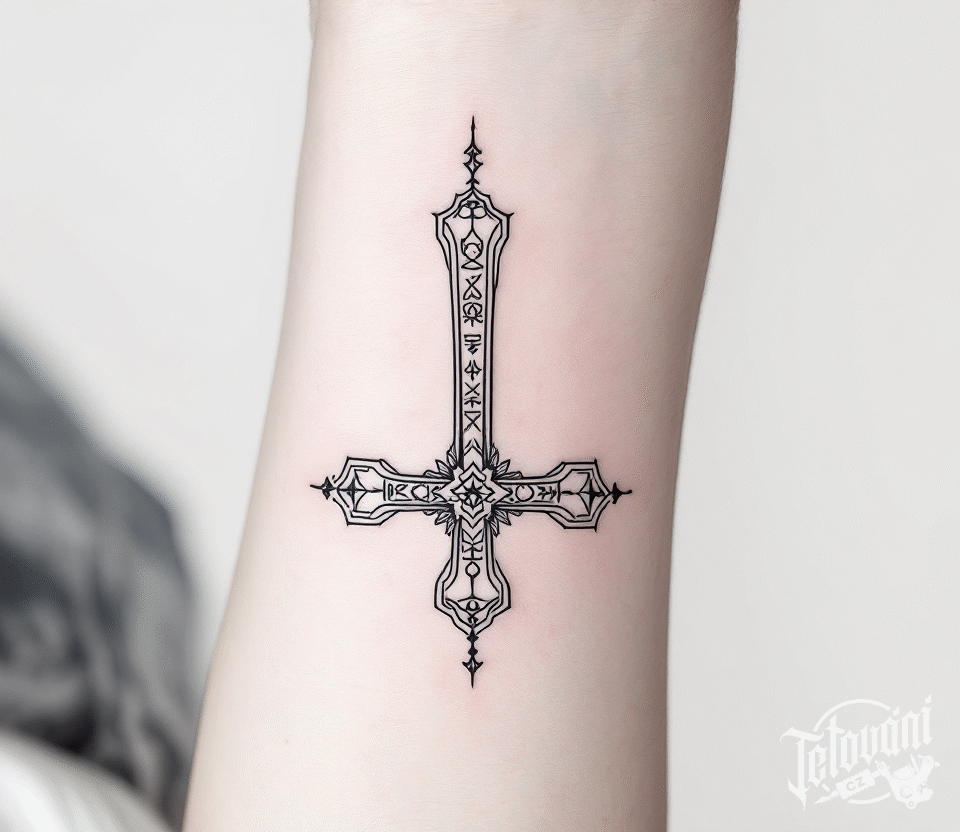 Tetování obrácený kříž se znaky a symboly na předloktí