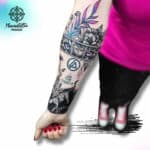 Tetování oči zvířete, květiny a nápisy na předloktí