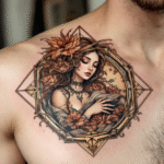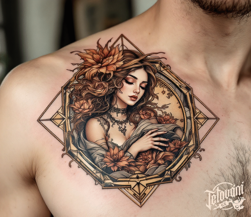 Tetování od Alfonse Muchy, portrét ženy s květinami hrudníku