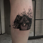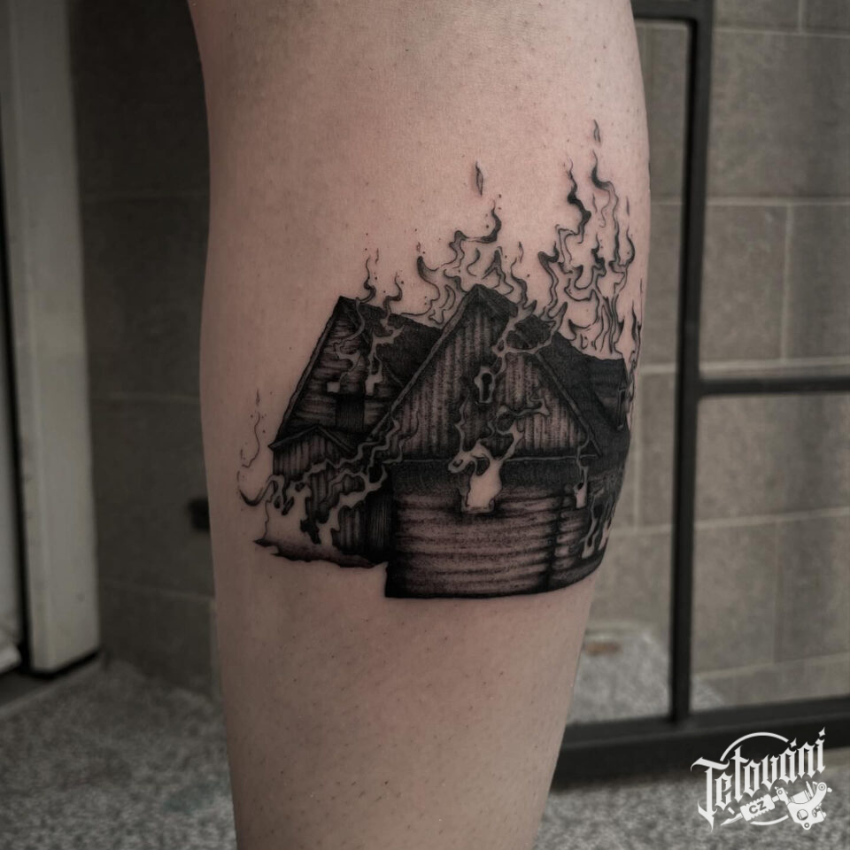 Tetování oheň, hořící domy, symbol nebezpečí na lýtko
