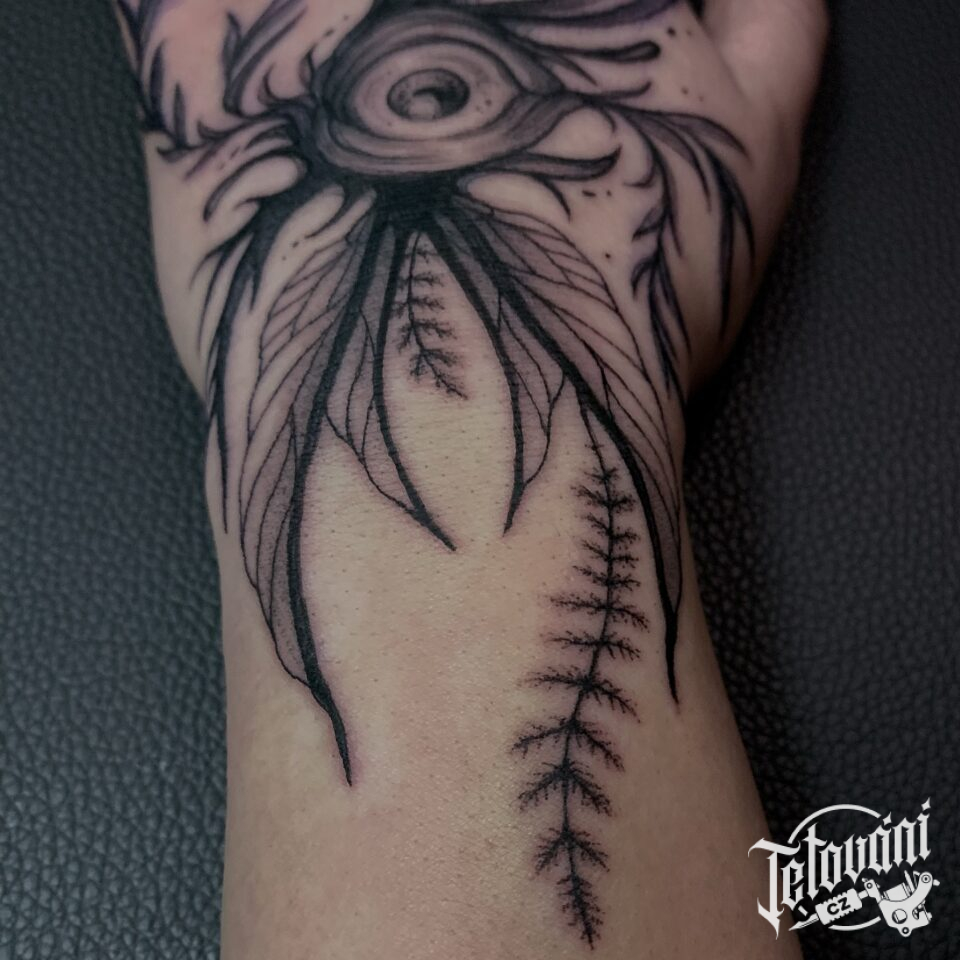 Tetování oko a květiny na hřbet ruky