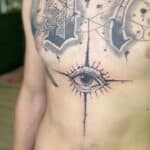 Tetování oko a nápis na hrudi