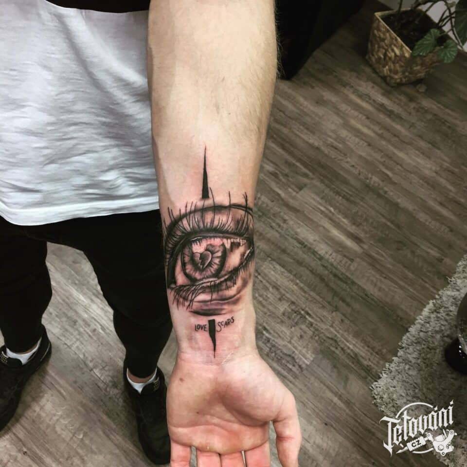 Tetování oko a nápis na předloktí
