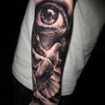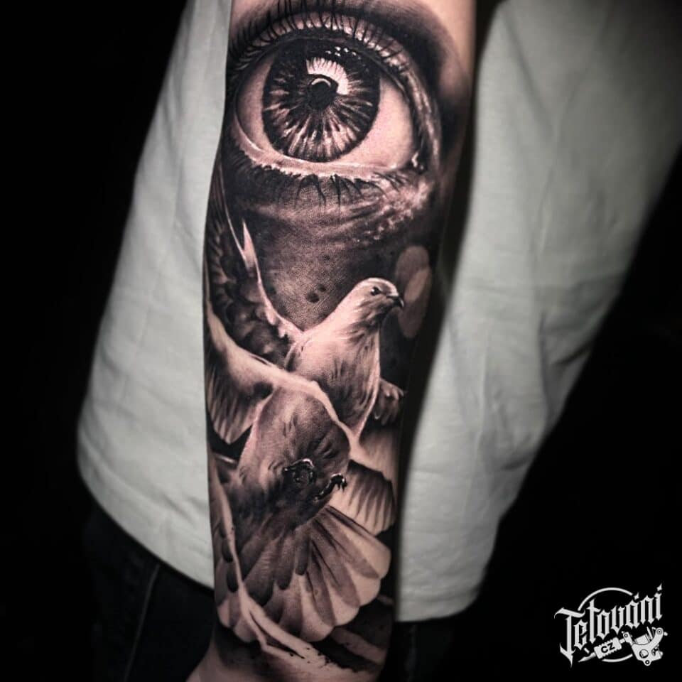 Tetování oko a zvířata, ptáci, holubice na předloktí