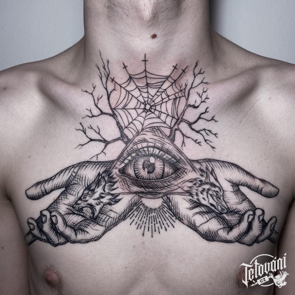 Tetování oko, boží oko, ruce a pavučina na hrudník