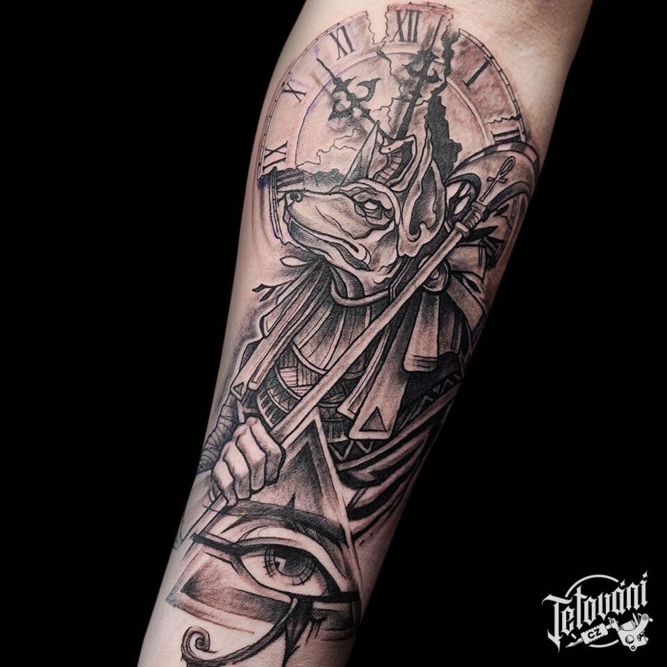 Tetování oko, egyptské oko, mýtické bytosti, Anubis a hodiny na předloktí