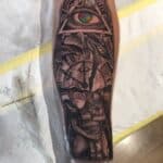Tetování oko, hodiny, rodina na předloktí