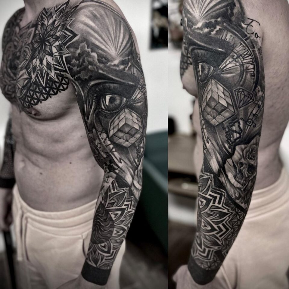 Tetování oko, kostka, hodiny rukáv