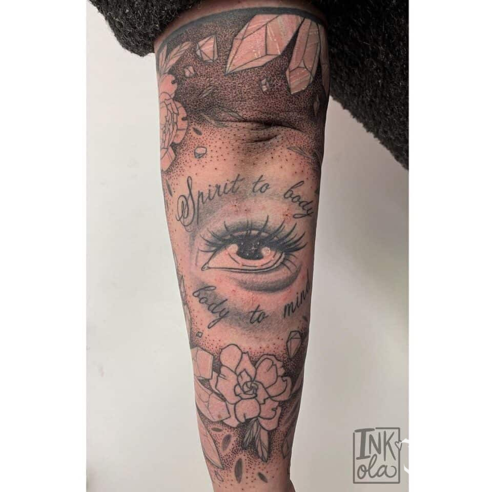 Tetování oko, květiny, nápisy na předloktí
