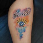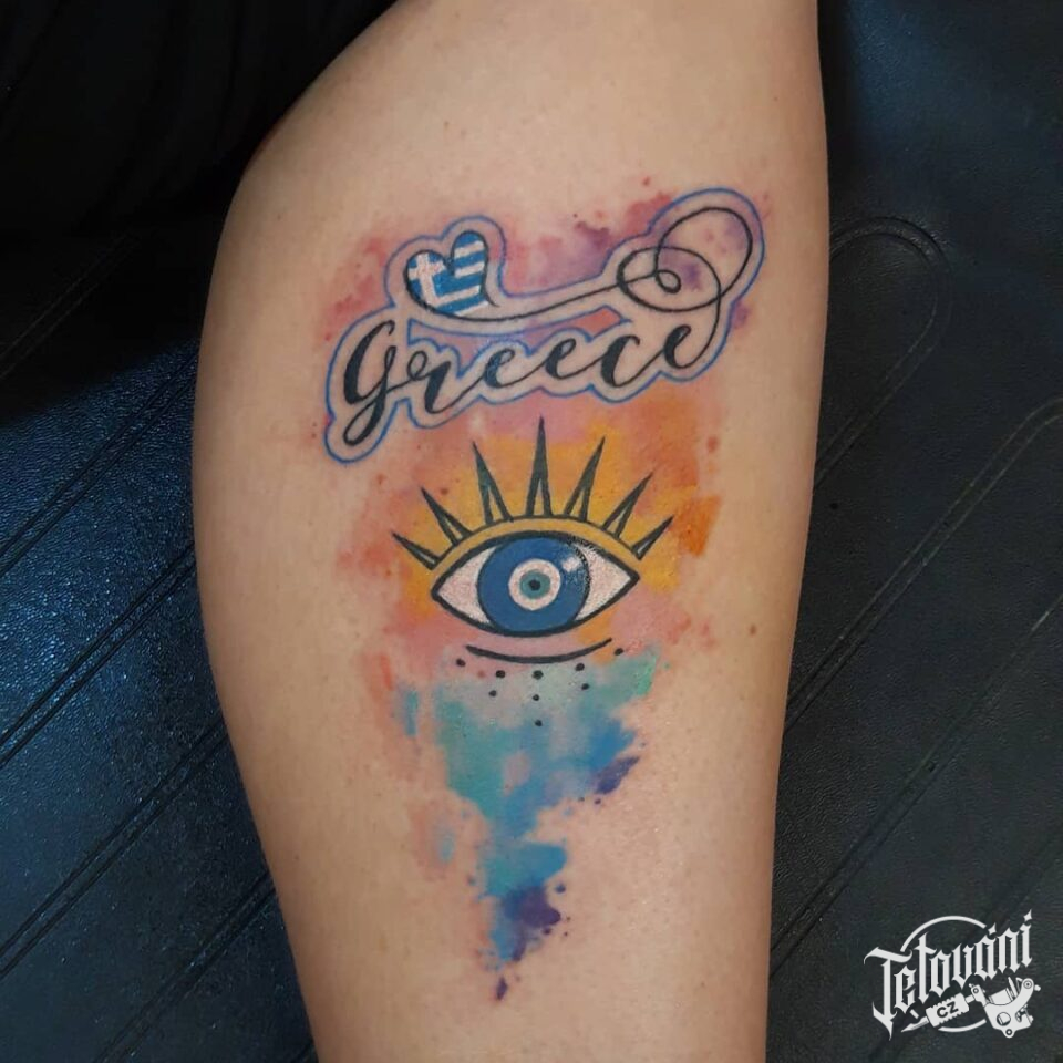Tetování oko, nápis na lýtko