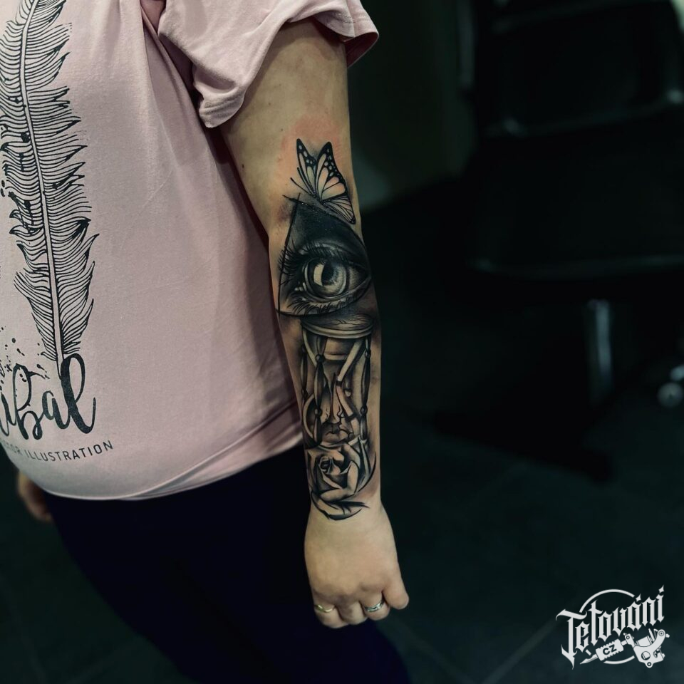 Tetování oko, přesýpací hodiny a růže, květina na předloktí