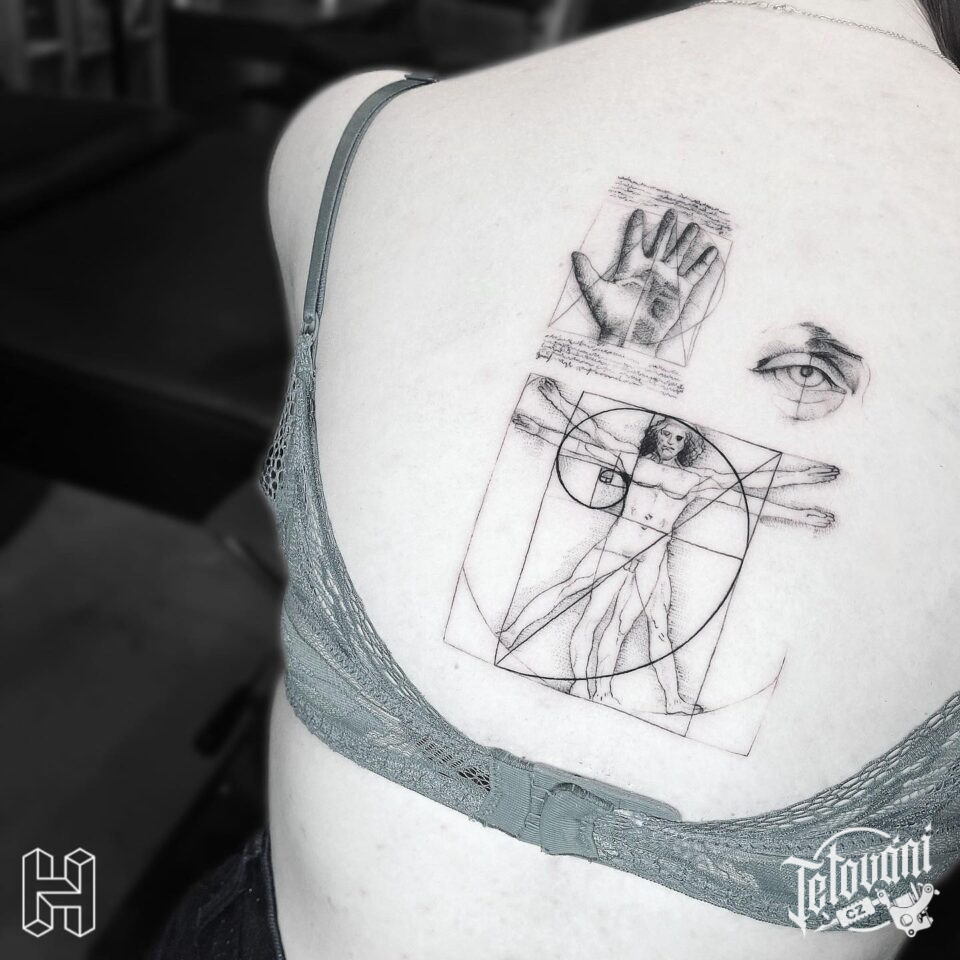 Tetování oko, ruka, postava na zádech