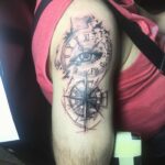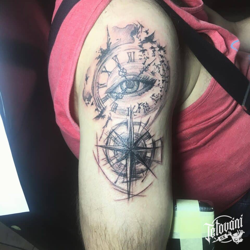 Tetování oko s hodinami a kompas na rameni