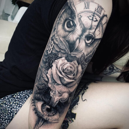 Tetování oko s hodinami, anděl, hrací kostky a karty na rameni