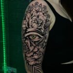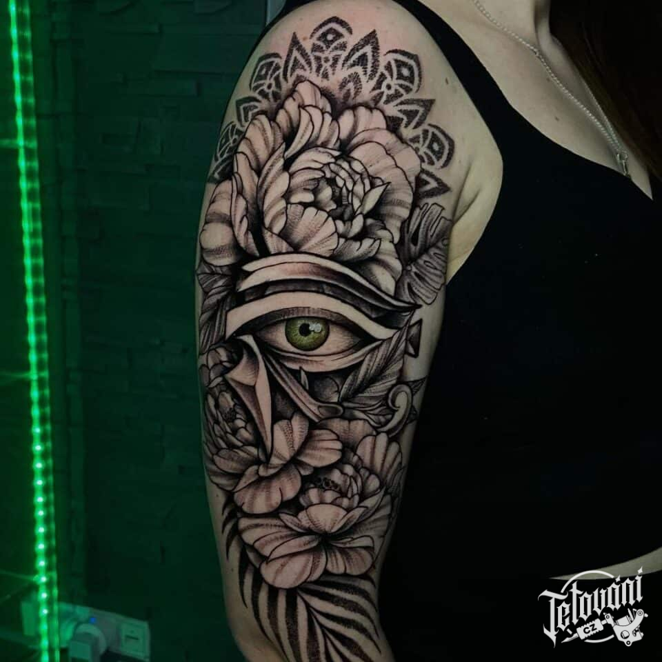 Tetování oko s květinami na rameni