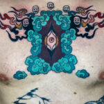 Tetování oko s ornamenty a nadpřirozené bytosti na hrudi