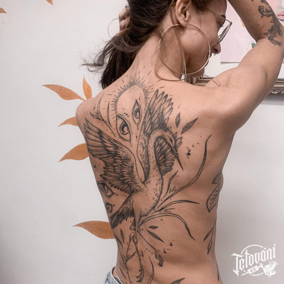 Tetování oko, slunce, zvířata ptáci, volavka na záda
