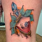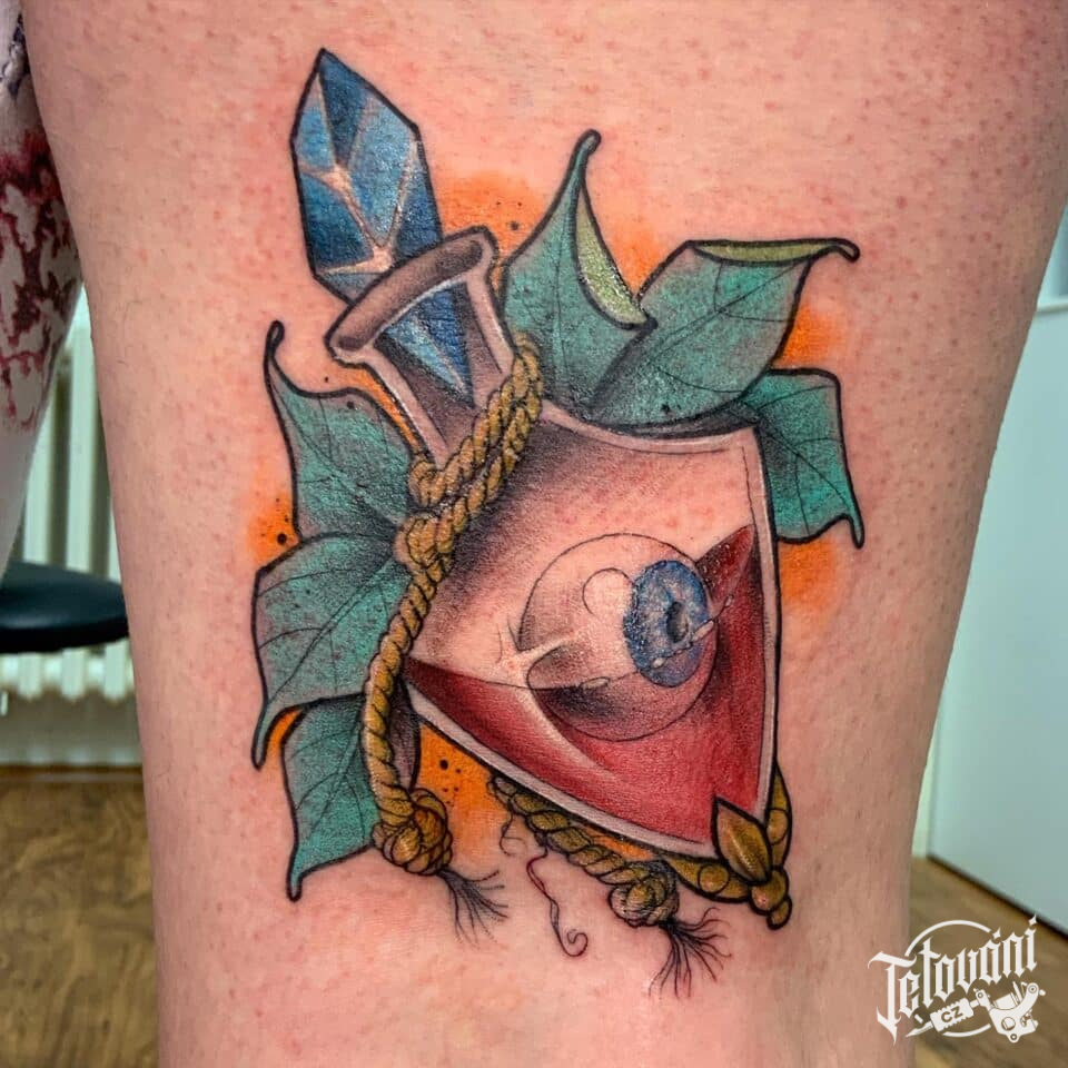 Tetování oko v láhvi na stehně