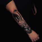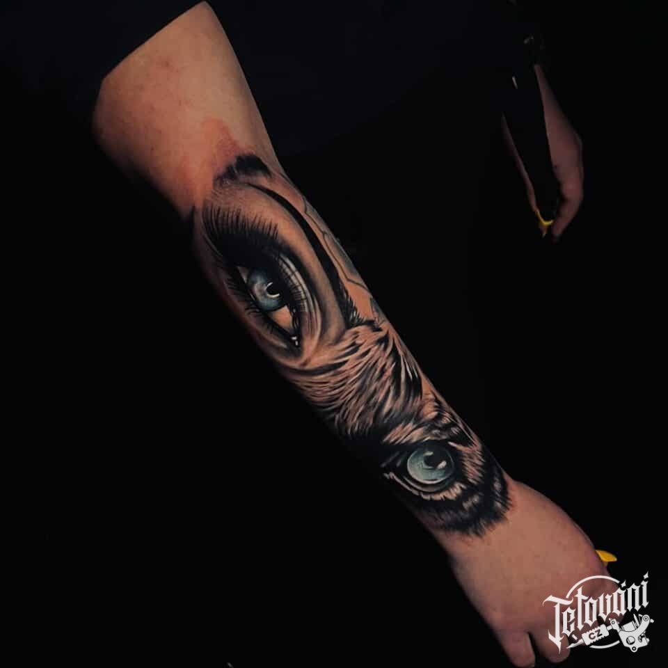 Tetování oko ženy a oko tygra, zvíře na předloktí