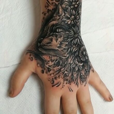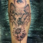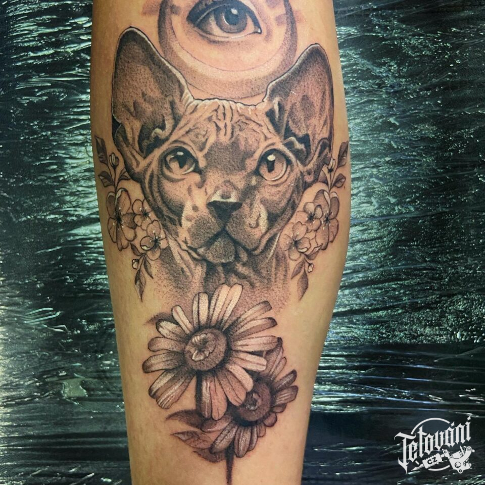 Tetování oko, zvíře kočka a kopretiny, květiny na předloktí