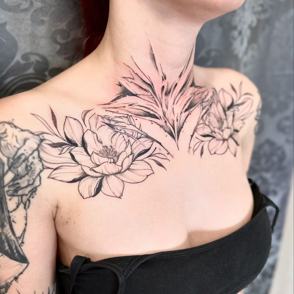 Tetování ornament a květiny na hrudi