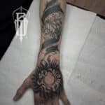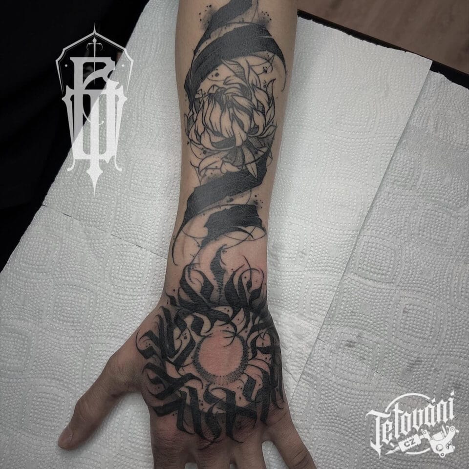 Tetování ornament, nápis na hřbetu ruky