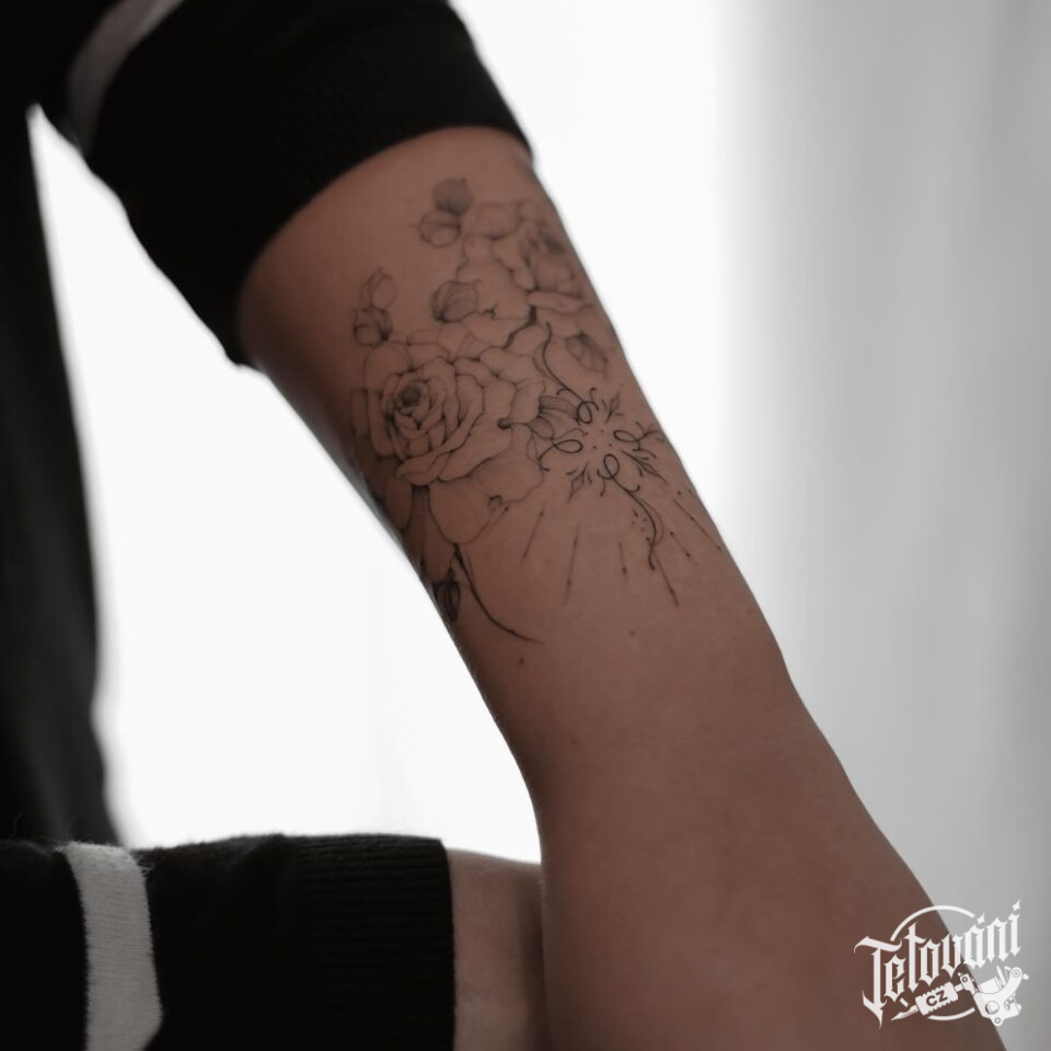 Tetování ornament s květinami na předloktí