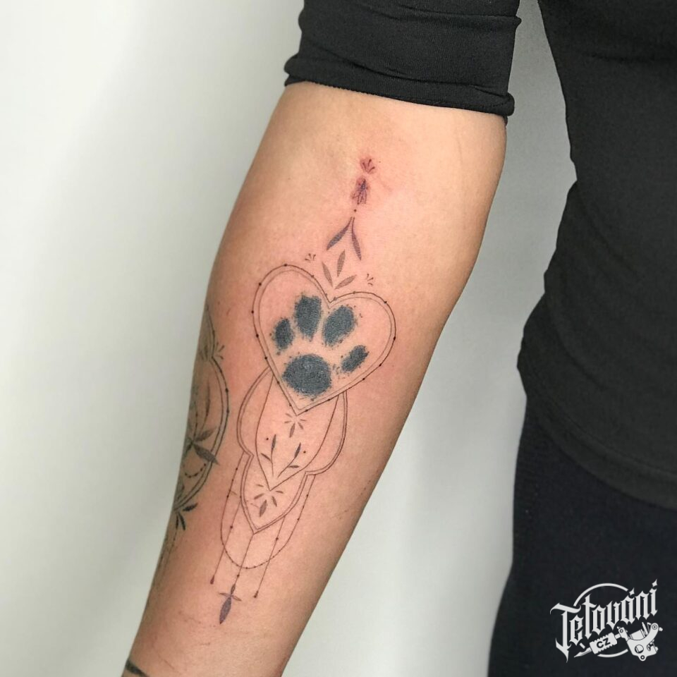 Tetování ornament se srdcem a psí tlapkou na předloktí