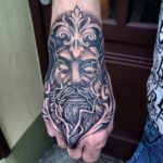Tetování ornamenty a mýtická bytost, Zeus na hřbetu ruky