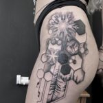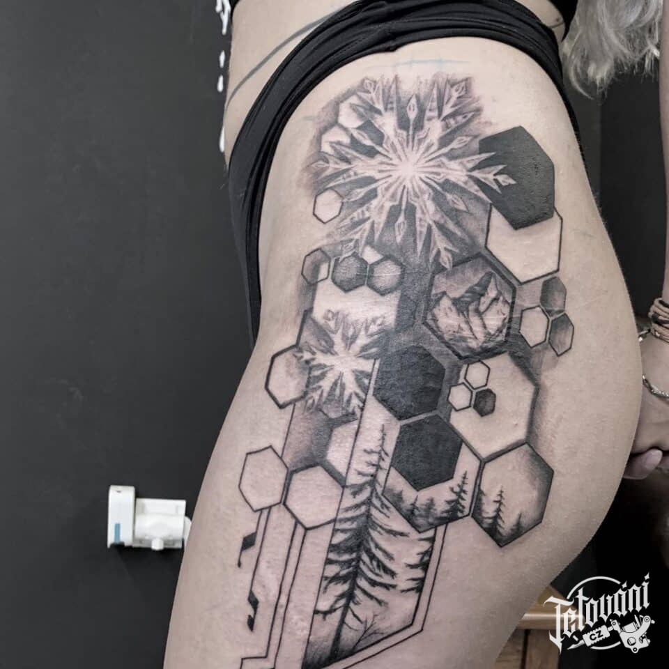 Tetování ornamenty a tvary, stromy a znaky a symboly vločky na boku stehna