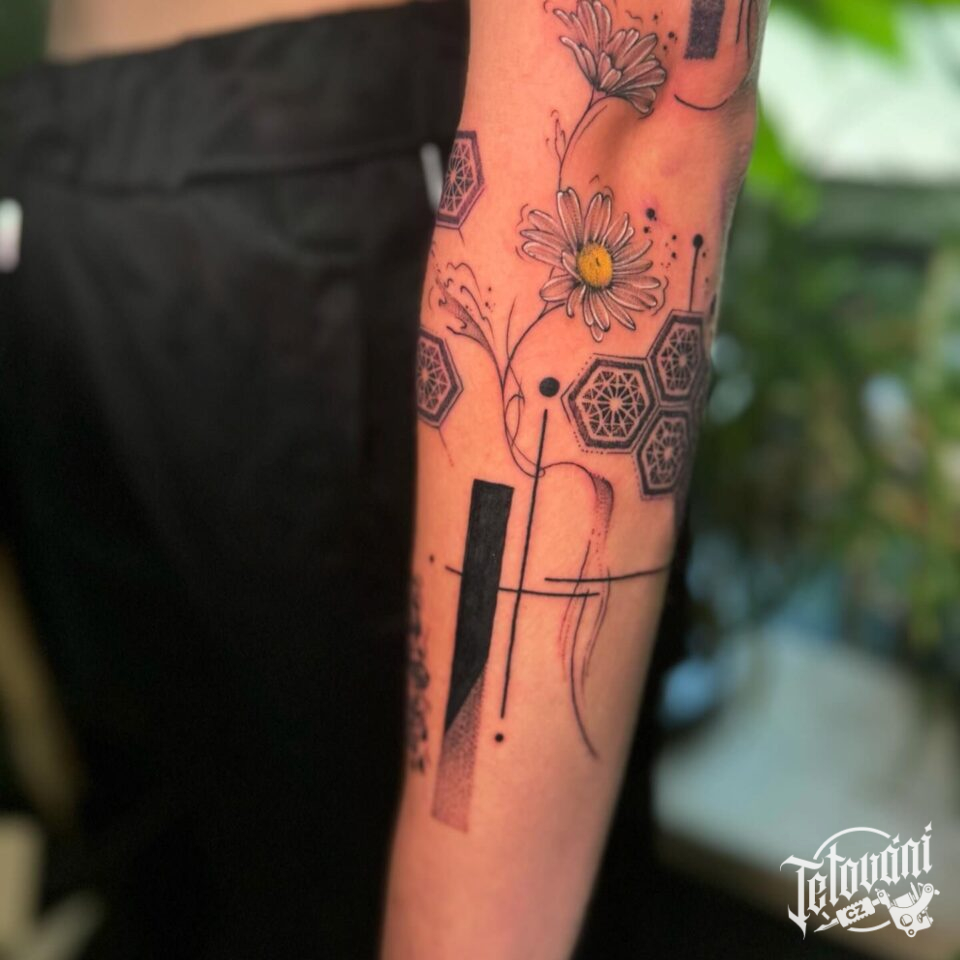Tetování ornamenty, čáry, pruhy, květina na předloktí