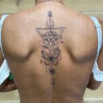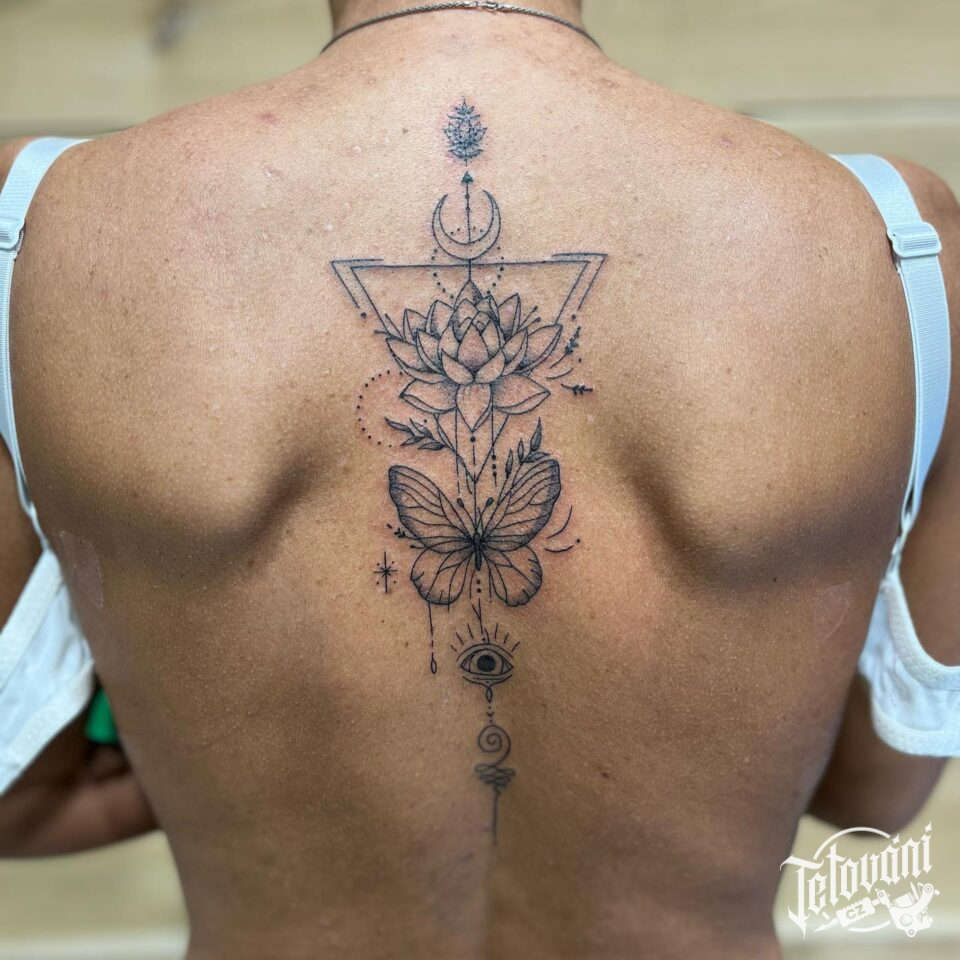 Tetování ornamenty, květina, motýl na zádech