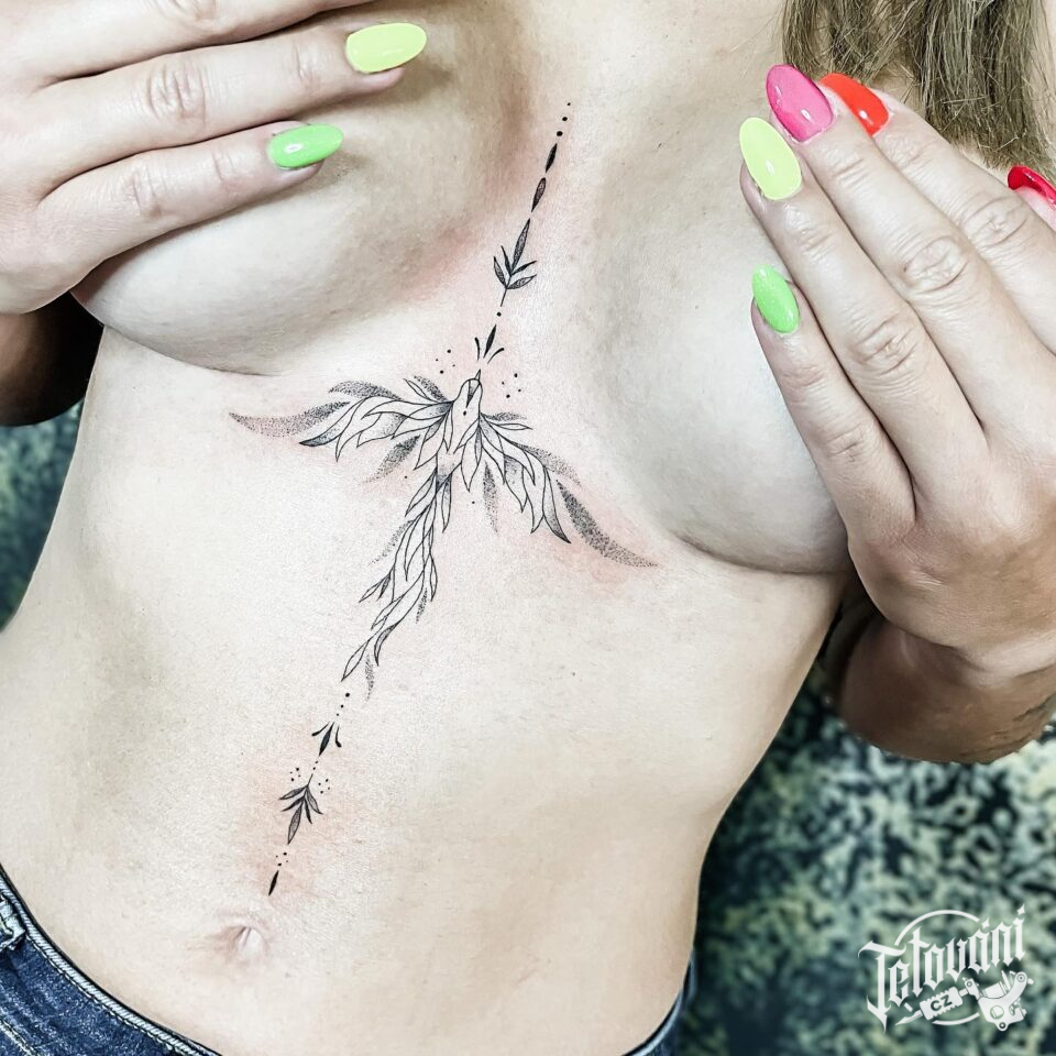 Tetování ornamenty, květiny mezi prsa a na břicho