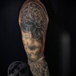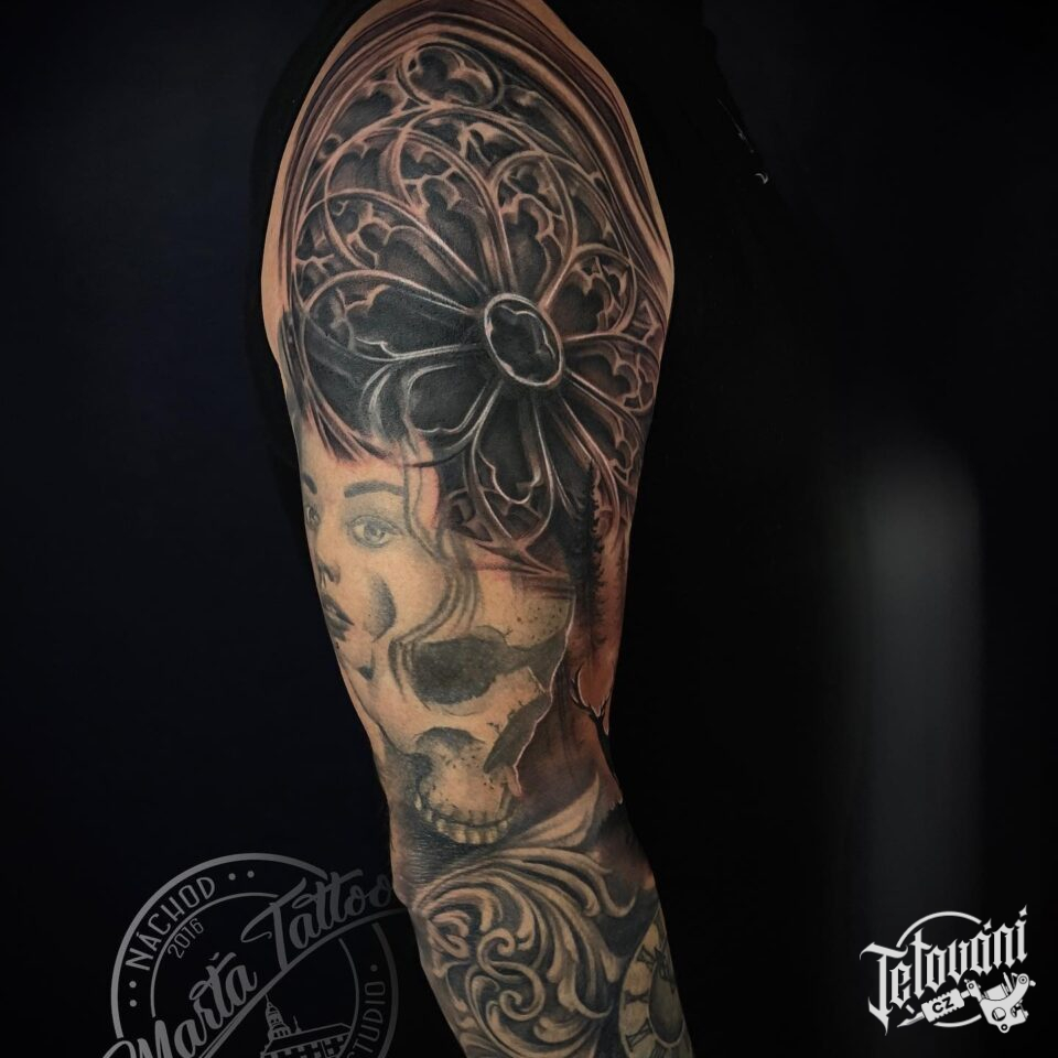 Tetování ornamenty, portrét ženy a lebka na rukáv