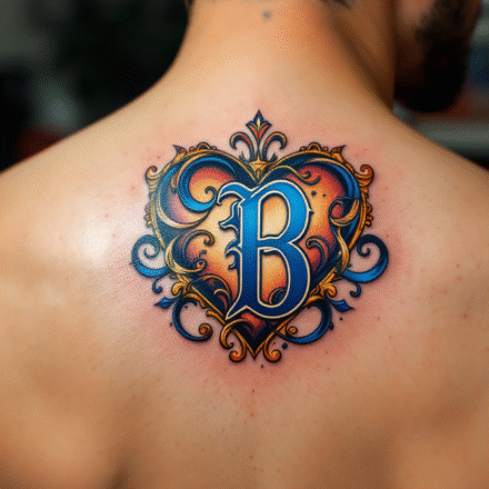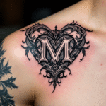 Tetování ornamenty srdce, srdce s písmenem M na klíční kost