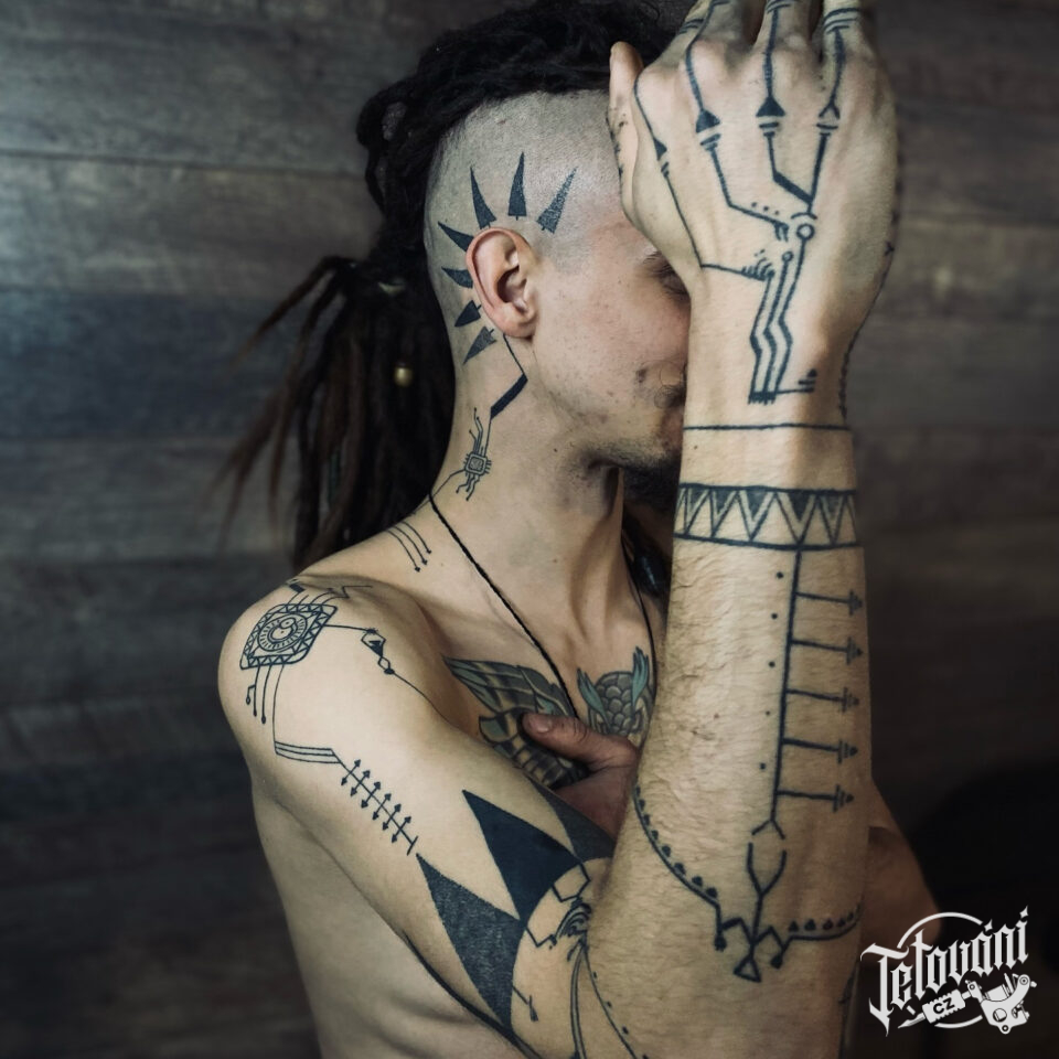 Tetování ornamenty, znaky a symboly, trojúhelníky, čáry, tvary, rukáv