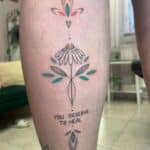 Tetování ornamenty, květina, nápis na lýtku