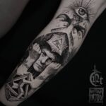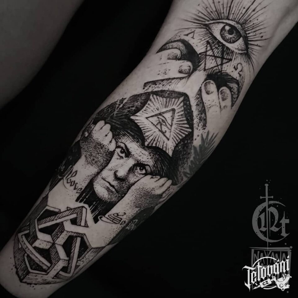 Tetování osobnosti Mistr Alesteir Crowley a třetí oko na předloktí